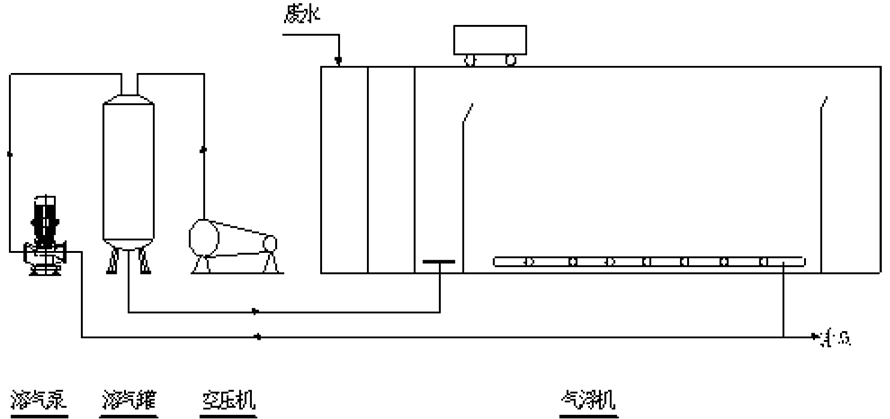該裝置主要起固液分離作用,去除廢水中的懸浮物(SS)、油污、色度,同時(shí)可以降低COD、BOD等污染物,主要利用溶氣系統(tǒng)產(chǎn)生的溶氣水中的微氣泡,與水中的懸浮物絮體碰撞粘合在一起,形成“微小氣泡—懸浮物復(fù)合體”,該“微氣泡—懸浮物復(fù)合體”逐漸共聚,體積變大,形成比重小于1的“氣泡—懸浮物復(fù)合體”。溶氣水在 0.3-0.5MPa的工作壓力的情況下,使空氣Max限度地溶入水中,通過(guò)減壓釋放,形成直徑在20μm-30μm左右的微小氣泡。